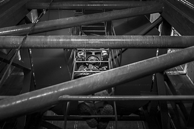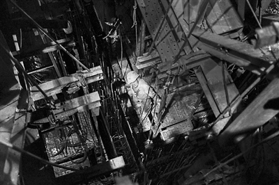 ② 在狭窄的施工平台上,一名工人挂着安全带攀爬于钢架之间。