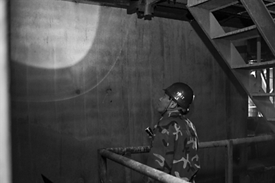 ④ 来自湖北的张荣喜正在观察顶升过程中承重墙的情况。