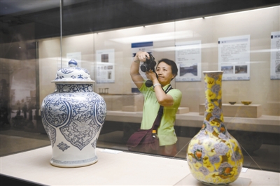 9月7日,参观者在甘肃省博物馆拍摄展出的文物。