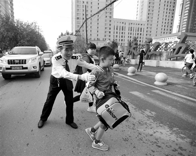 9月5日,沈阳市珠江五校门前,身穿警服的李栓良忙着疏导过往车辆,并护送学生安全入校。李栓良曾是沈阳市的一名交通警察。他从警40年,纠正违章无数,先后被公安部授予“全国优秀人民警察”和“二级英模”称号。2011年退休以后,他来到这里义务担起交通梳理和护送孩子的工作,几年来风雨无阻。视觉中国 供图
