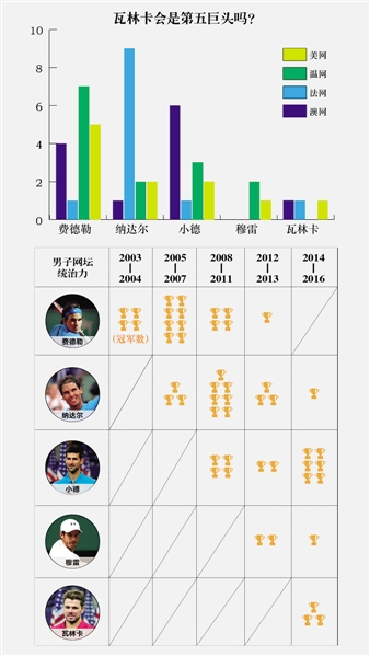 当一群球员向四巨头发起冲击时,瓦林卡是率先突围出来的那一个。3个不同的大满贯冠军奖杯在手,理论上而言,瓦林卡甚至有机会先于四巨头之一的穆雷完成全满贯。