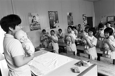 9月13日,“爱心月嫂”在培训教室上婴儿护理课。
