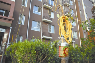 9月11日,在山东省菏泽市的某小区,部分住户为方便给停放在楼下的电动汽车充电,纷纷从楼上的家中扯下电线。充电后草草收拾,或堆放在角落,或挂在树上,有些为了防止插板被雨淋,还用塑料瓶给插板做了保护壳。