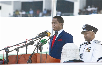 9月13日,赞比亚总统埃德加·伦古在就职仪式上致辞。当日,赞比亚总统就职仪式在赞首都卢萨卡国家英雄体育场举行,多国政要、各国驻赞比亚使节等五万余人出席。新华社记者 彭立军 摄