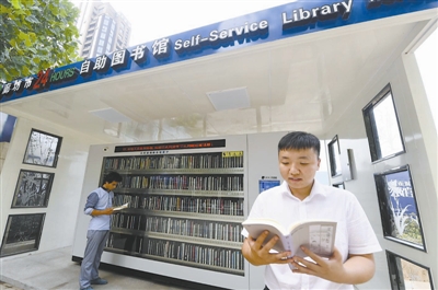 9月13日,廊坊市广阳区孔雀公馆社区居民阅读在“24小时自助图书馆”内借到的图书。