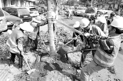 近日,江苏连云港市对主城区主次干道受冻害未复苏的行道树进行集中更换,主要更换为耐寒、抗性强、树形优美的榉树、黄山栾树、大叶女贞、广玉兰等树种。今年初,连云港遭遇罕见“极寒”天气,数千棵行道树受冻害枯死。随着高温天气逐步缓和,连云港市开始对受冻的盐河路、瀛洲路、海昌路等1114棵行道树进行集中更换,有效提升城区主次干道绿化景观效果。图为园林工人在栽种大叶女贞。耿玉和 摄