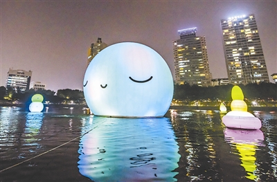 2016年9月7日,韩国首尔,乐天世界塔和韩国松坡区政府在悬浮于石村湖面直径20米的“超级月亮”模型周围布设恒星、行星等天体模型,营造星月同辉胜景。 东方IC 供图