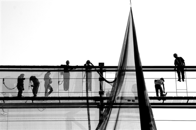 9月12日,中国最大的铁矿石中转码头——宁波舟山港鼠浪湖矿石中转码头的工人正在紧张地挂设挡风防尘网。