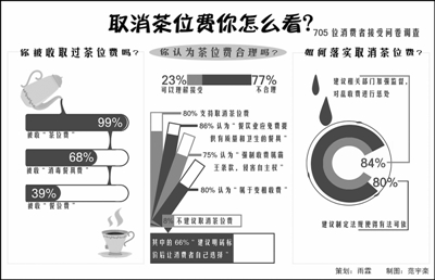 广州市消委会介绍,日前,消委会在全市范围内利用网络开展民意调查。数据显示,接受问卷调查的705位消费者中,有99%的消费者被收取过茶位费,68%被收取过消毒餐具费,39%被收取过餐位费。