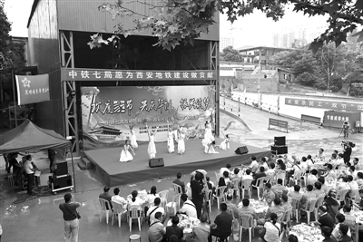 9月12日,在西安地铁五号线的建设工地上,中铁七局西安公司机关的女同志在表演快板舞《振兴筑梦促发展》。当日,奋战在西安地铁工地上的近百名职工和农民工,由于工期紧张,不能回家与家人共度佳节。中铁七局西安公司精心编排了一场“欢度‘家’节,共庆华诞,振兴筑梦”联欢会,通过歌曲、舞蹈、相声、小品、情景剧等形式让职工和农民工提前度过了一个欢乐的中秋节。