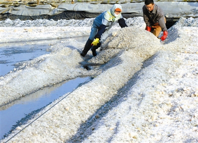 9月18日,工人在江苏连云港市台北盐场大浦工区进行扒盐作业。