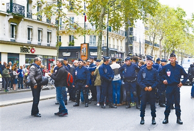 9月17日,在法国首都巴黎,警察在街头媒体吹风会现场执勤。