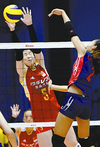 9月18日,在越南永福举行的2016年第五届女排亚洲杯四分之一决赛中,中国队以3比0战胜中华台北队,晋级四强。图为中国队球员李静(左)拦网。 新华社发(王申 摄)
