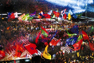 图为闭幕式上印有各国语言“爱”字样的旗帜在场内挥舞。
