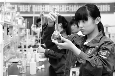 9月18日,在山东化工技师学院,来自济南技师学院的参赛选手王雨(右一)在参加化学分析操作比赛。