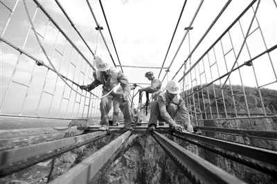 9月19日,湖南平江石牛寨玻璃桥的工人在垂直高度180米的玻璃桥上更换被刮花的玻璃,以保证洁净。