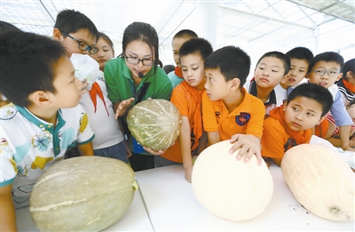 9月19日,农业示范基地的技术员沈玉艳(左三)给青岛市上清路小学的学生讲解南瓜的生长常识。