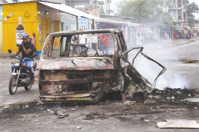 当地时间9月20日,刚果(金)首都金沙萨,因反对派游行要求政府如期举行总统选举∮部分地区发生较大规模骚乱,目前示威者与军警冲突已造成44人死亡。图为遭焚烧的车辆。 东方IC 供图