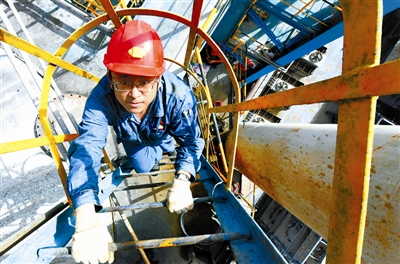 兰州的8月,30多摄氏度的高温,70多米高的炼油塔上,记者找到刚从油罐中爬出来的卢朝鹏。