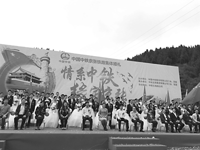 9月26日,一场别开生面的集体婚礼在中铁五局四公司承建的京张铁路八达岭隧道工地举行,28对来自中国中铁股份有限公司的新人在祝福中携手步入婚礼殿堂。