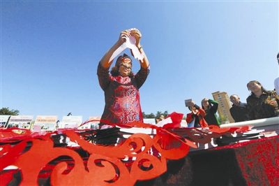 9月23日,在山西广灵县剪纸文化广场上,高清红蒙住双眼向乡亲们展示她精湛的手撕剪纸艺术操作法。