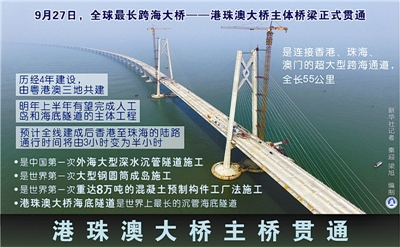 9月27日,全球最长跨海大桥——港珠澳大桥主体桥梁正式贯通。此前几天,世界最大跨度公铁两用斜拉桥——沪通长江大桥28号主塔墩承台混凝土浇筑也完美收官。两座“世界之最”桥梁均进入新的建设阶段。