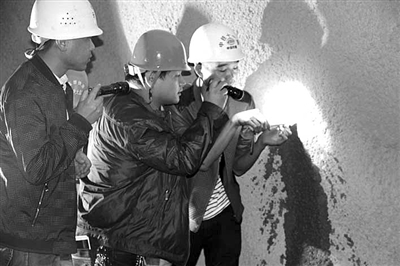 玉磨铁路是云南省和全国在建铁路地质结构最复杂、桥梁隧道工程量最大、线路最长的山区铁路。昆明铁路局质量监督站在对玉磨铁路建设质量动态监管时,坚持“一点不能差,差一点也不行”的原则,严把质量关。图为监督人员在中铁十一局玉磨项目部认真检查混凝土初支厚度。郑传海 摄