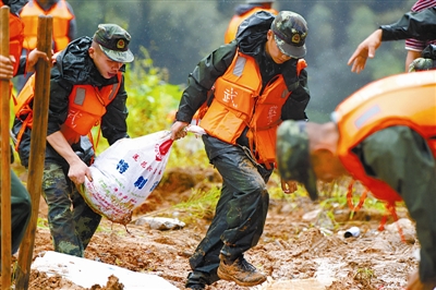 9月28日,今年第17号台风“鲇鱼”4时40分在福建省惠安沿海登陆。图为武警泉州支队官兵在现场抢险施救。 新华社记者 姜克红 摄