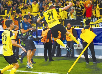 9月27日,在2016~2017赛季欧洲冠军联赛F组比赛中,多特蒙德队主场以2比2战平皇家马德里队。图为多特蒙德队球员许尔勒(上)在比赛中庆祝进球。新华社/法新