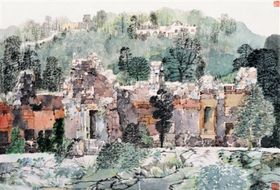 在展出的卢禹舜《古城逢春 》中,作品只选取柬埔寨古城吴哥古城殿堂寺宇林立的其中一角,描绘墙垣四周吐出的春绿,由小窥大,用灵动的笔法、洗练的色彩和充沛的水色,于宁静优雅中表达出对历史的随想和怅叹。