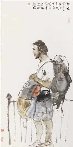 如刘大为的《机场背包客》,随着东非国家毛里求斯的旅游业不断发展,越来越多的世界游客涌入这个景色怡人的岛国,机场中的背包客构成了一道独特的风景。作者将背景留白用以凸显人物形象,没骨晕染与实线单勾相结合塑造形体和服饰的虚实相生,展现出极为纯熟的造型功力和丰富的视觉效果。