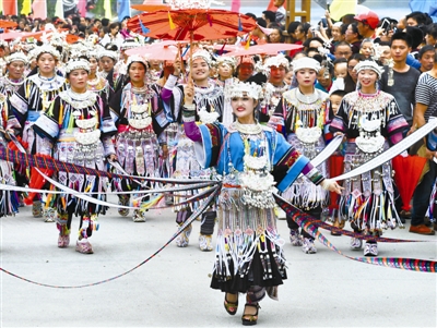 10月1日,在贵州省锦屏县,少数民族同胞表演锦鸡舞。 新华社发(陈礼杏 摄)
