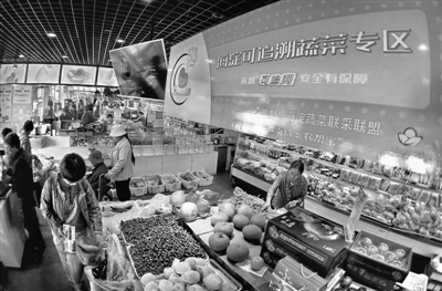 10月6日,市民在海淀区中关村街道的“车客家园”社区副食连锁店可追溯食品专柜选购。