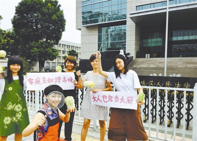 这天,一群家庭“煮妇”专门前来支持高晓,表明对就业性别歧视的强烈不满。