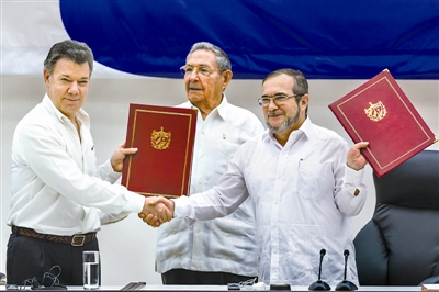 挪威诺贝尔委员会7日宣布,桑托斯获2016年诺贝尔和平奖。这是今年6月23日,在古巴领导人劳尔·卡斯特罗(中)的见证下,桑托斯(左)和“哥伦比亚革命武装力量”指挥官蒂莫莱翁·希门尼斯在古巴首都哈瓦那交换和平协议的资料照片。新华社记者 刘彬 摄