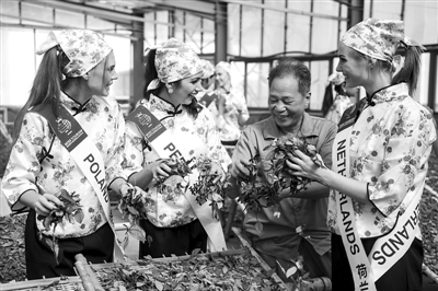图为外国参赛佳丽在白茶阴干房与制茶师傅交流学习。