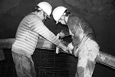 10月10日,玉磨铁路项目部新华隧道3号斜井工人在拼装拱架。