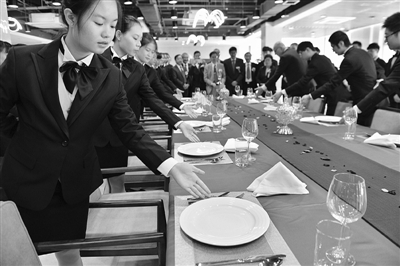 10月10日,上海杉达学院酒店管理(高级管家方向)本科专业的学生正在课堂上练习正确端放餐盘。