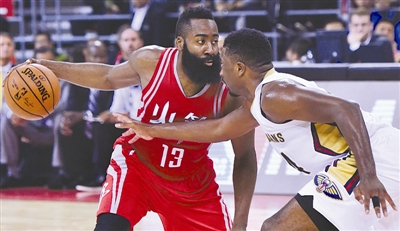 第10届NBA中国赛北京站,火箭对鹈鹕。图为火箭球星哈登(左)准备进攻。本报记者 许之丰 摄