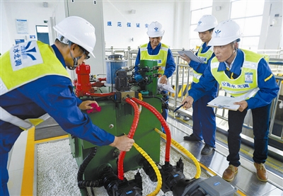 10月13日,南水北调中线干线鹤壁管理处的工作人员在淇河倒虹吸出口闸室内检测输水设备运行情况。