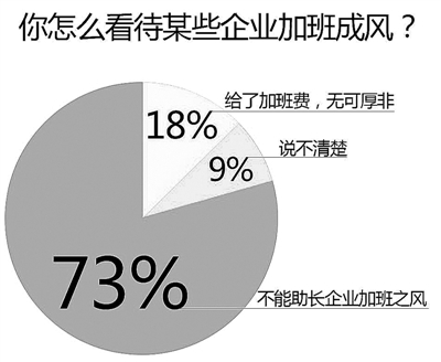怎么看待某些企业加班成风?73%的网友表示“不能助长企业加班之风”;18%的网友表示“给了加班费,无可厚非”;还有9%的网友表示“说不清楚”。