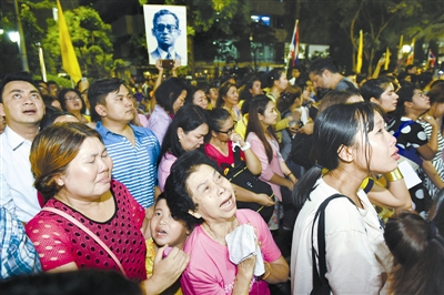 10月13日,在泰国首都曼谷的诗丽叻医院外,民众悼念泰国国王普密蓬·阿杜德。