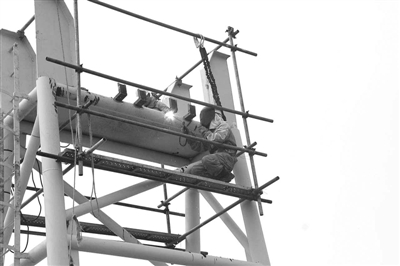 那几天天气酷热,陈惠新穿着厚重的防晒服,汗如雨下,毛巾系在脖子上随时擦汗。在甲板以上20米、距离海面达35米的地方,枕木放置处只能容下陈惠新一人。1987年出生的蔡东升在2010年成为陈惠新的徒弟,他回忆说,自己刚工作时,上去走几步腿都抖,明知道掉不下去,但就是害怕。