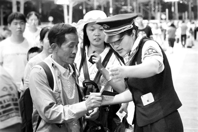 在北京开往南昌的Z65次列车上,列车组成员全部由女性组成。她们每趟列车需要连续工作12个小时,全程不能用手机,实在困了只能趴在休息室的桌子上休息一会。在晃动的列车上,她们不仅要完成对乘客的日常服务工作,还要完成车厢清扫、行李整理、垃圾回收等重体力劳动。图为开车前,徐琴在耐心地为乘客做引导。本报记者 王伟伟 摄