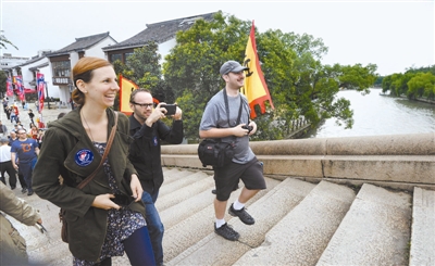 当日,2016中美旅游年系列活动之一“千名美国游客游江南水乡”在苏州启动,千名美国游客从新市桥码头乘坐游船至盘门码头,沿途欣赏苏州古运河美景和水城文化,感受浓浓的江南风情。 新华社发 杭兴微 摄
