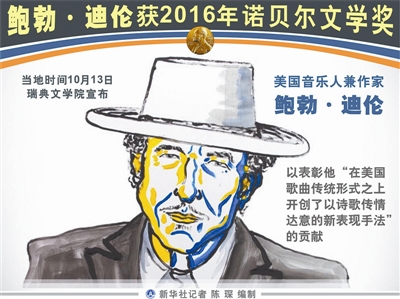 新华社消息(记者和苗 付一鸣)瑞典文学院13日宣布,将2016年诺贝尔文学奖授予美国音乐人兼作家鲍勃·迪伦。