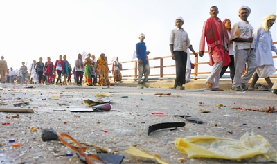 10月15日,印度北方邦瓦拉纳西,人们走过踩踏事故现场。