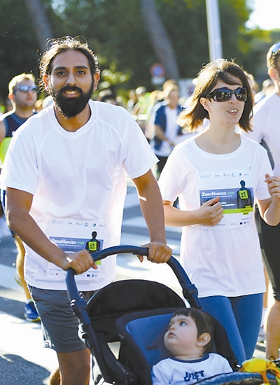10月16日是世界粮食日,当天在意大利罗马举行了“零饥饿赛跑”活动,图为参赛选手推着婴儿车参加活动。新华社记者 金宇 摄