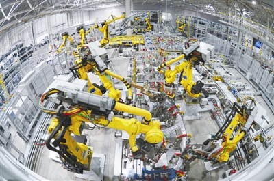 图为10月18日,机器人在北京现代沧州工厂焊接车间生产线上工作。