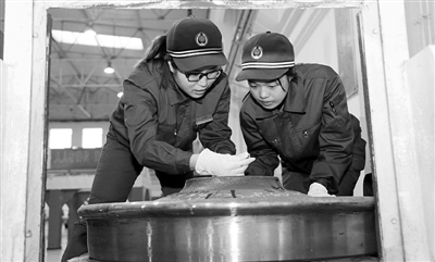 10月11日,吉林车辆段车轮车间轮对组装岗位,一位年轻的师傅(左)正在给徒弟讲解利用内径千分棒测量轮毂孔内径的技术要领。据介绍,这个段在一线岗位开展师带徒活动,发挥技术骨干“传帮带”优势,让新职人员在岗位上学习,在实践中锻炼,快速成长成才。刘浩 孙红玉 摄